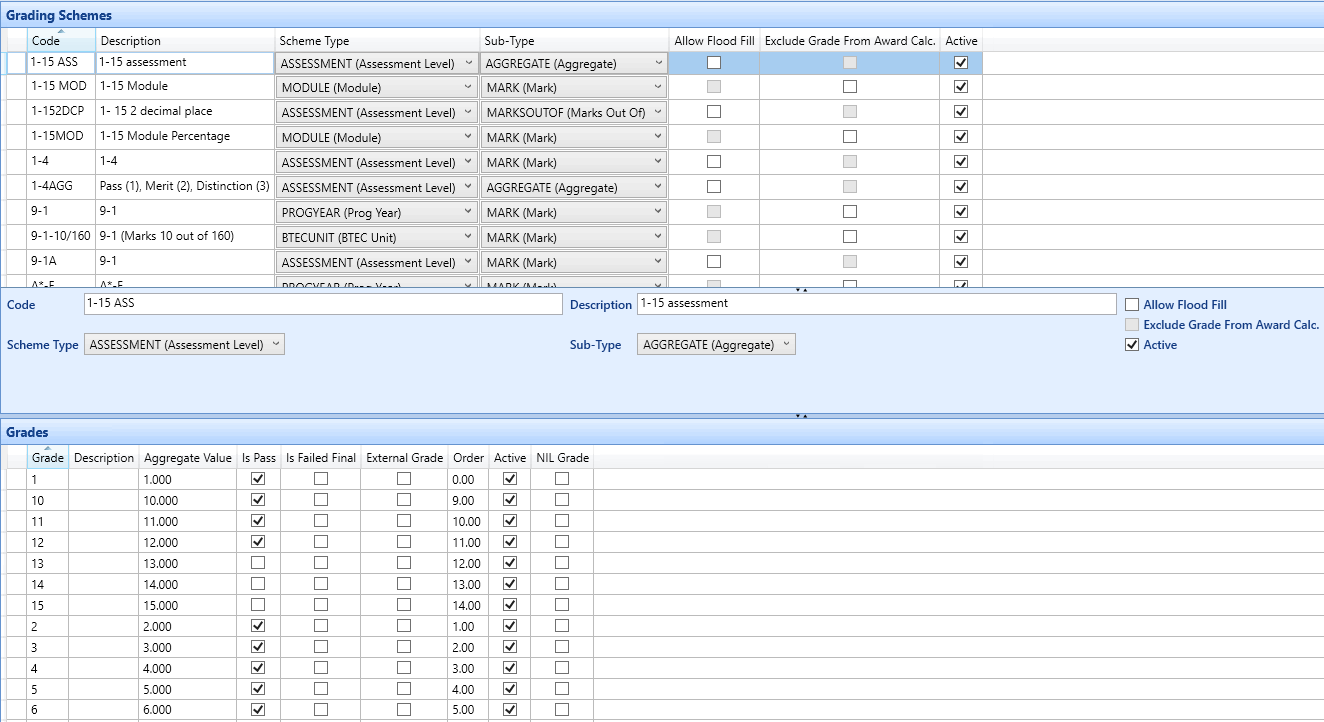 For each grading scheme you need to select a scheme type and sub type. This combination determines the type of grades that are entered into the markbook, ex. a number or a letter grade. You can then further customise each grading scheme to determine which marks are passing, if they equate to a specific grade or it is the final grade.