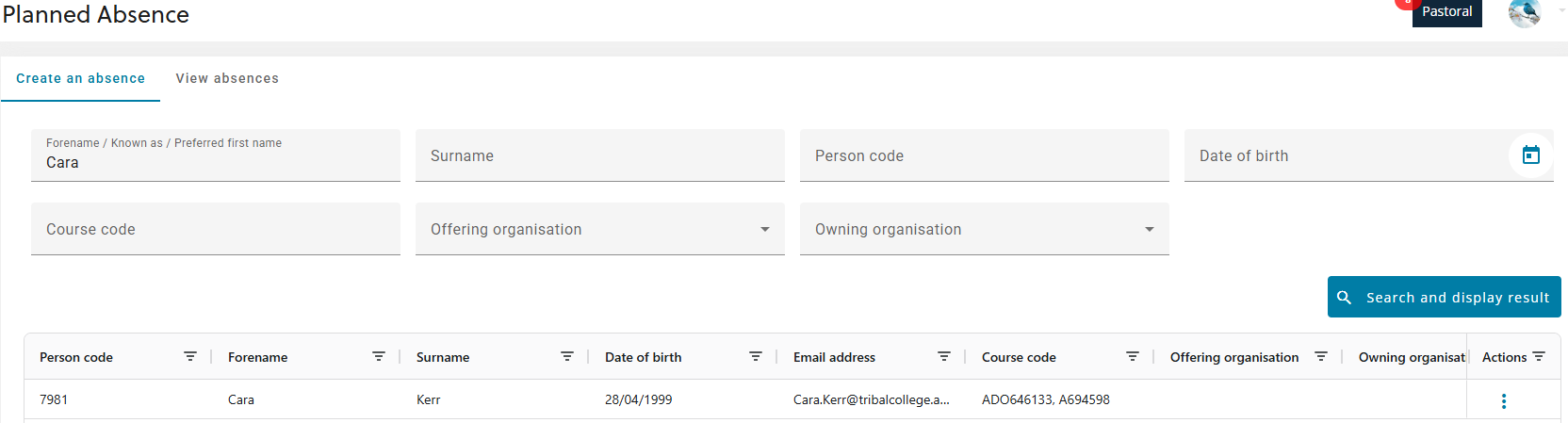 Use the create an absence tab to report a learner’s absence. You can search for learners by name, person code, and other details, then record when they were absent, why they were absent, and any supporting evidence.