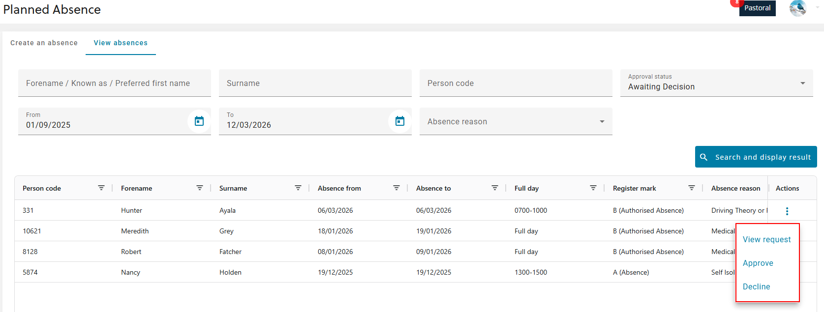 The image below shows a search for absences that are awaiting a decision and the options to view, approve, or decline the request from the grid.
