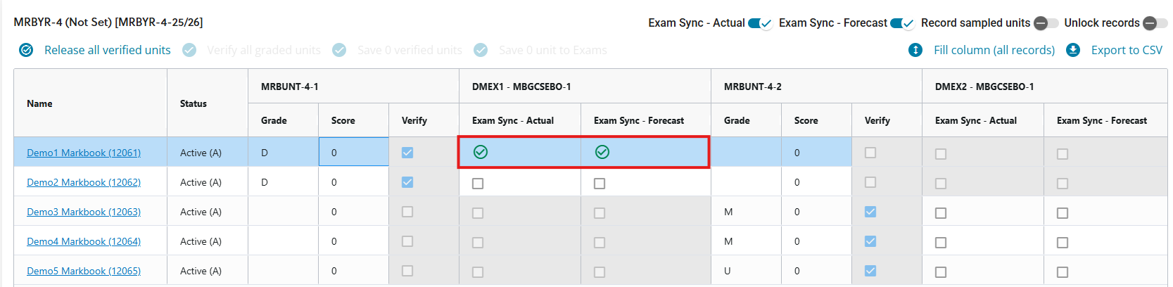Grades must be verified before the Exam Sync – Actual and Exam Sync – Forecast checkboxes become available.The image below shows the Markbook Verification grid after grades have been successfully synced to Exams Manager.